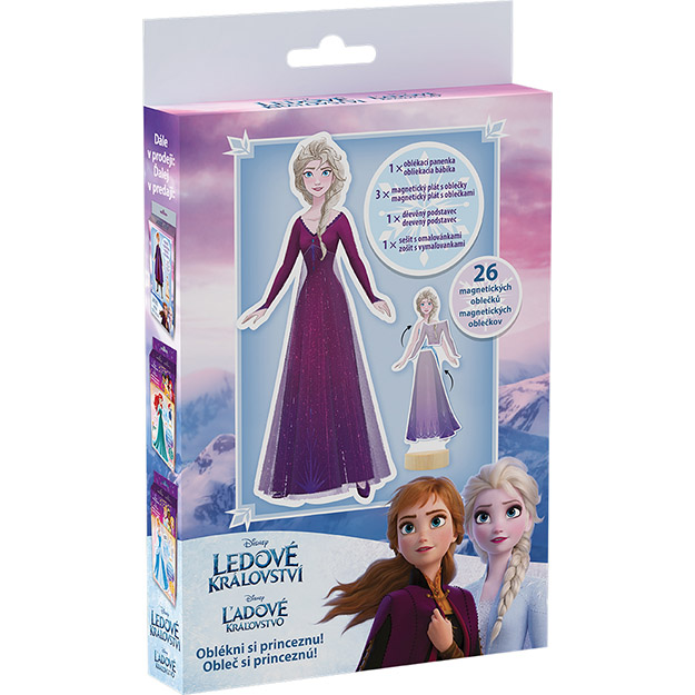Balení obsahuje magnetickou panenku s dřevěným stojánkem, 3 archy magnetických šatů, bot a doplňků a omalovánku s 8 obrázky.