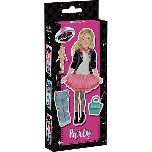 Balení obsahuje oblékací postavičku, 3 archy magnetických částí oblečení, bot a doplňků a dřevěný podstavec.