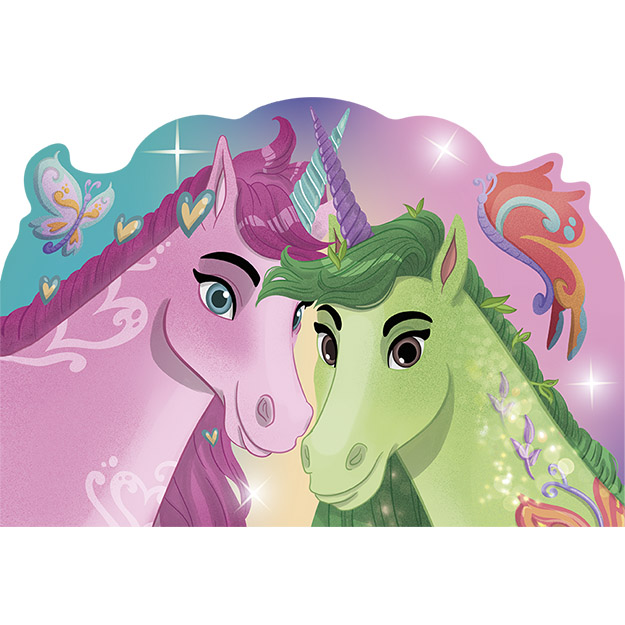 Omalovánky obsahují 24 originálně tvarovaných stran černobílých obrázků k vybarvení a 2 listy samolepek k dolepení.